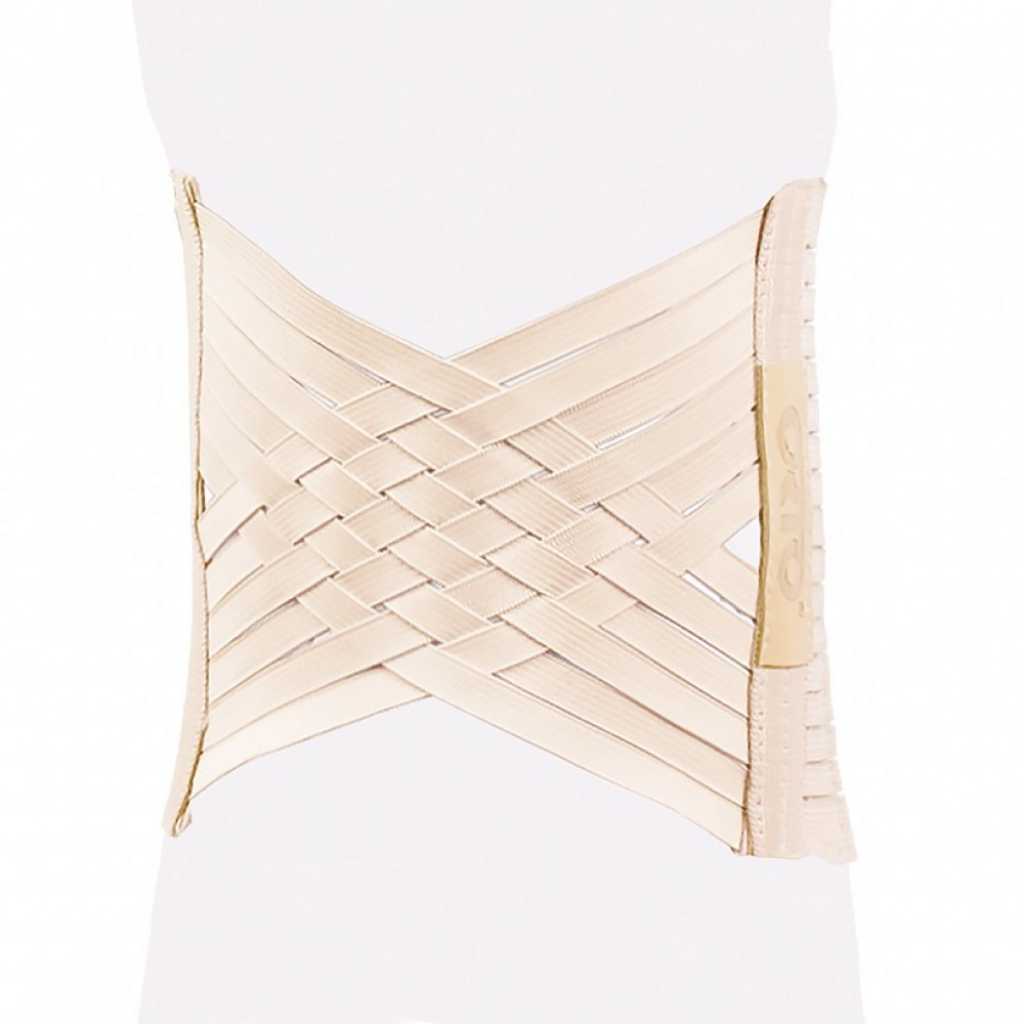 Передняя часть бандажа выполнена из переплетения тонких эластичных ремней. Фиксация осуществляется с помощью дискретной застежки «Велкро».