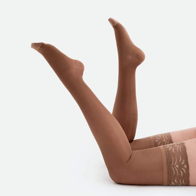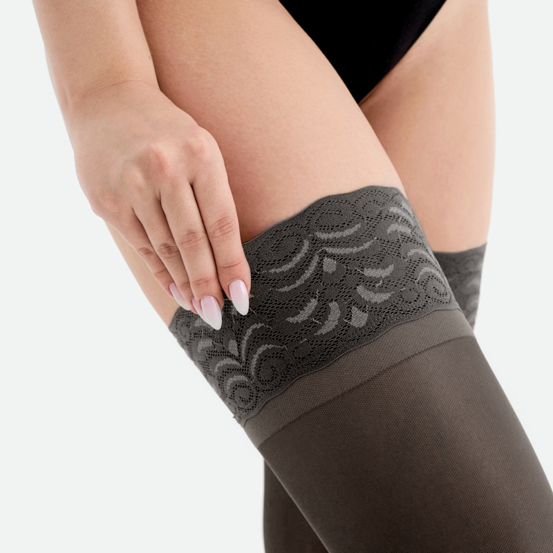 - Широкая резинка с рисунком на ленточном силиконе обеспечивает надежную фиксацию чулок на ноге;