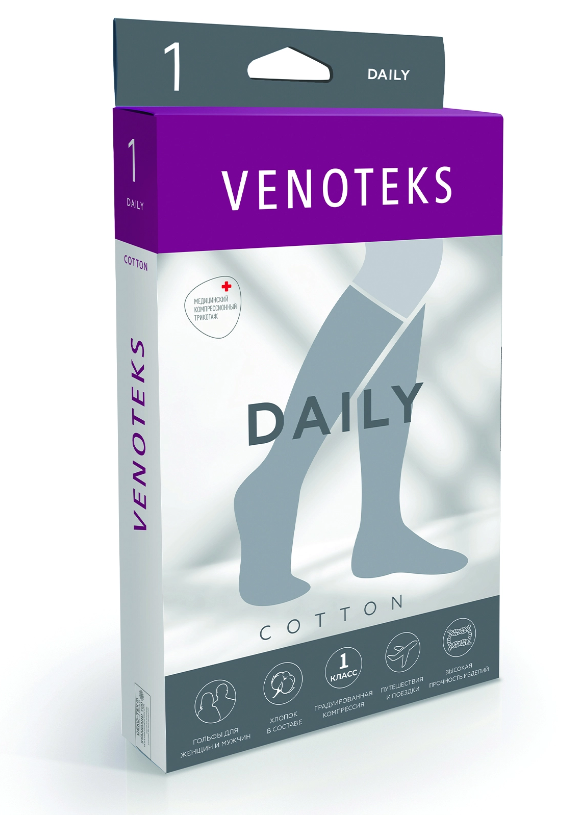 Медицинские компрессионные гольфы VENOTEKS DAILY с хлопком подходят для повседневного использования как женщинам, так и мужчинам с чувствительной кожей, склонной к аллергическим реакциям. Изготовлены по европейским стандартам качества с учетом анатомического строения стопы. Хлопчатобумажные волокна впитывают излишки влаги и пота на ногах и сохраняют их внутри, снижая риск роста бактерий на коже. Обеспечивают элегантный внешний вид и комфорт в течение всего дня. Подходят под любой стиль одежды.