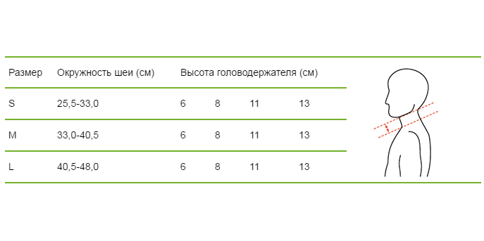 • Размер головодержателя (S, M, L) выбирается в зависимости от окружности шеи. Для каждого размера предусмотрена высота 6, 8, 11 и 13 см.