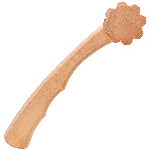 Универсальный массажёр из натуральной берёзы отлично снимает напряжение в мышцах. Лучше всего работает на спине, руках и ногах. Восстанавливает циркуляцию крови в тканях, снимает отёчность, гармонизирует тонус нервной системы и борется с целлюлитом. Массаж можно легко совместить с ароматерапией, т. к. дерево легко пропитывается нагретыми маслами, надолго сохраняя их запах.