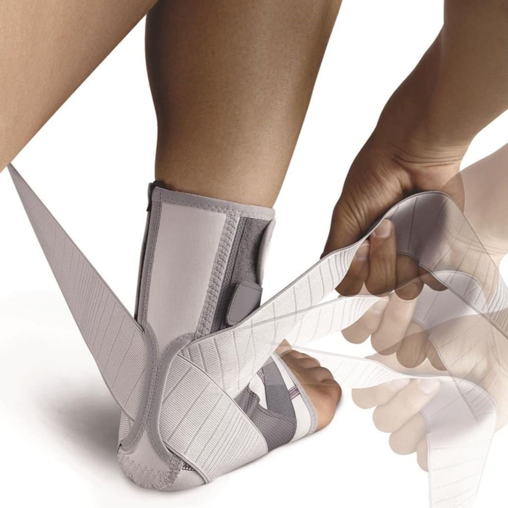 Эластичные фиксирующие ленты со встроенным фиксатором на пятке, в сочетании с функциональной лентой, обеспечивают индивидуально регулируемую компрессию вокруг голеностопного сустава, а силиконовая аппликация на внутренней стороне ортеза стимулирует проприоцепцию.