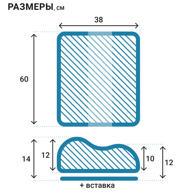 Подушка имеет универсальный размер не требует специального подбора. Высота регулируется за счет вставки из эластичного пенополиуретана. Размер подушки без вставки 38х60х10(12см), со вставкой 38х60х12(14) см.