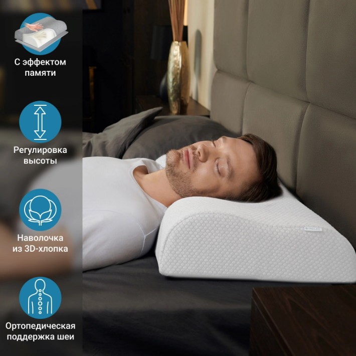RESPECTA for man – это инновационная модель с возможностью регулировки высоты и особой наволочкой из 3D хлопка. Основание подушки изготовлено из вязкоэластичного пенополиуретана с «эффектом памяти», благодаря этому подушка максимально подстраиваются под особую анатомию каждого человека, а специальные валики оказывают необходимую ортопедическую поддержку. RESPECTA for man идеально подходит для сна в любом положении.