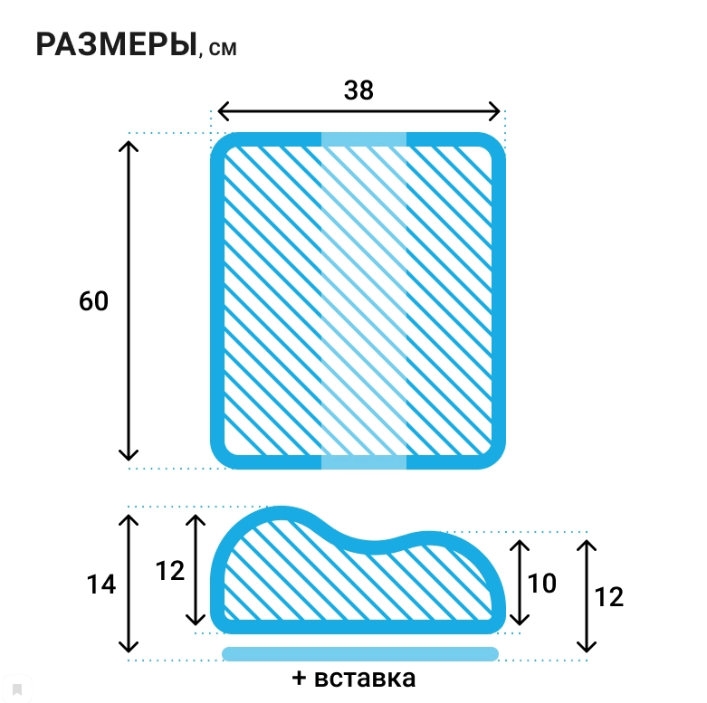 Подушка имеет универсальный размер не требует специального подбора. Высота регулируется за счет вставки из эластичного пенополиуретана. Размер подушки без вставки 38х60х10(12см), со вставкой 38х60х12(14) см.
