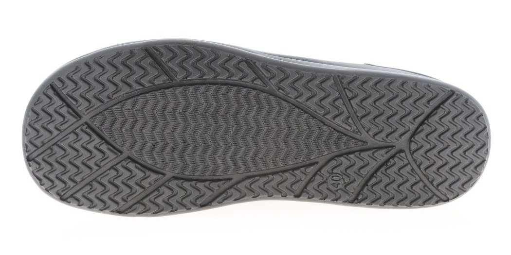 - Нескользящая подошва из полиуретана цельнолитого типа обеспечена небольшим подъемом в области пятки.