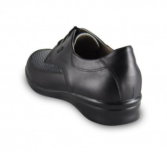 Полуботинок снабжен несколько большей чем обычно уплотненной задней частью, сформированной из термопласта. Она позволяет надежно фиксировать пяточную область в естественном положении, к тому же задник держит форму достаточно долгое время. Изнутри ботинки достаточно широки, а вставка из трикотажа отлично растягивается, что позволяет добавить в обувь орто-стельку, индивидуально изготовленную.