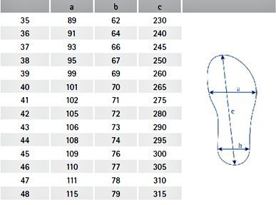 Обувь снабжена тремя вкладными стельками, каждая толщиной 5 мм и плотностью 50 по Шору, верхнюю стельку рекомендуется оставлять для облегчения гигиенического ухода. В случае какой-либо деформации стопы верхняя стелька может быть заменена на ортопедическую индивидуальную. Объем обуви можно регулировать при помощи вкладных стелек и застежек. Модели отдельно подбираются на правую и левую стопу.